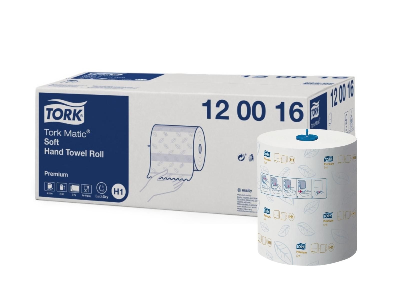 Ekstra miękki ręcznik w roli pozwala doskonale zadbać o wizerunek łazienki: jest miękki i zdobi go dekor w kształcie niebieskiego listka. Szybko i dokładnie osusza dłonie dzięki technologii QuickDry™. Rolki pasują do Tork Matic® dozownika do ręczników w roli.